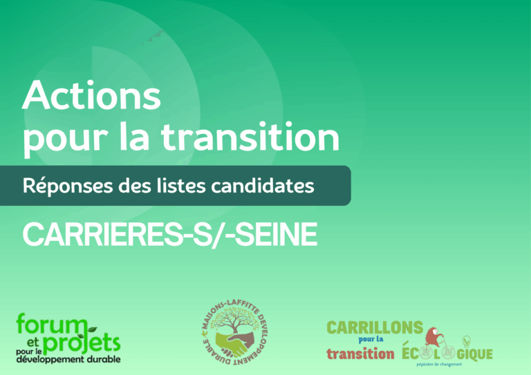 • En juillet 2025, Forum Projets Développement Durable, Carrillons pour la Transition, et Maisons-Laffitte Développement Durable, 3 associations apartisanes territoriales de transition écologique et sociale coopèrent pour que le mandat 2026-2032 permette :